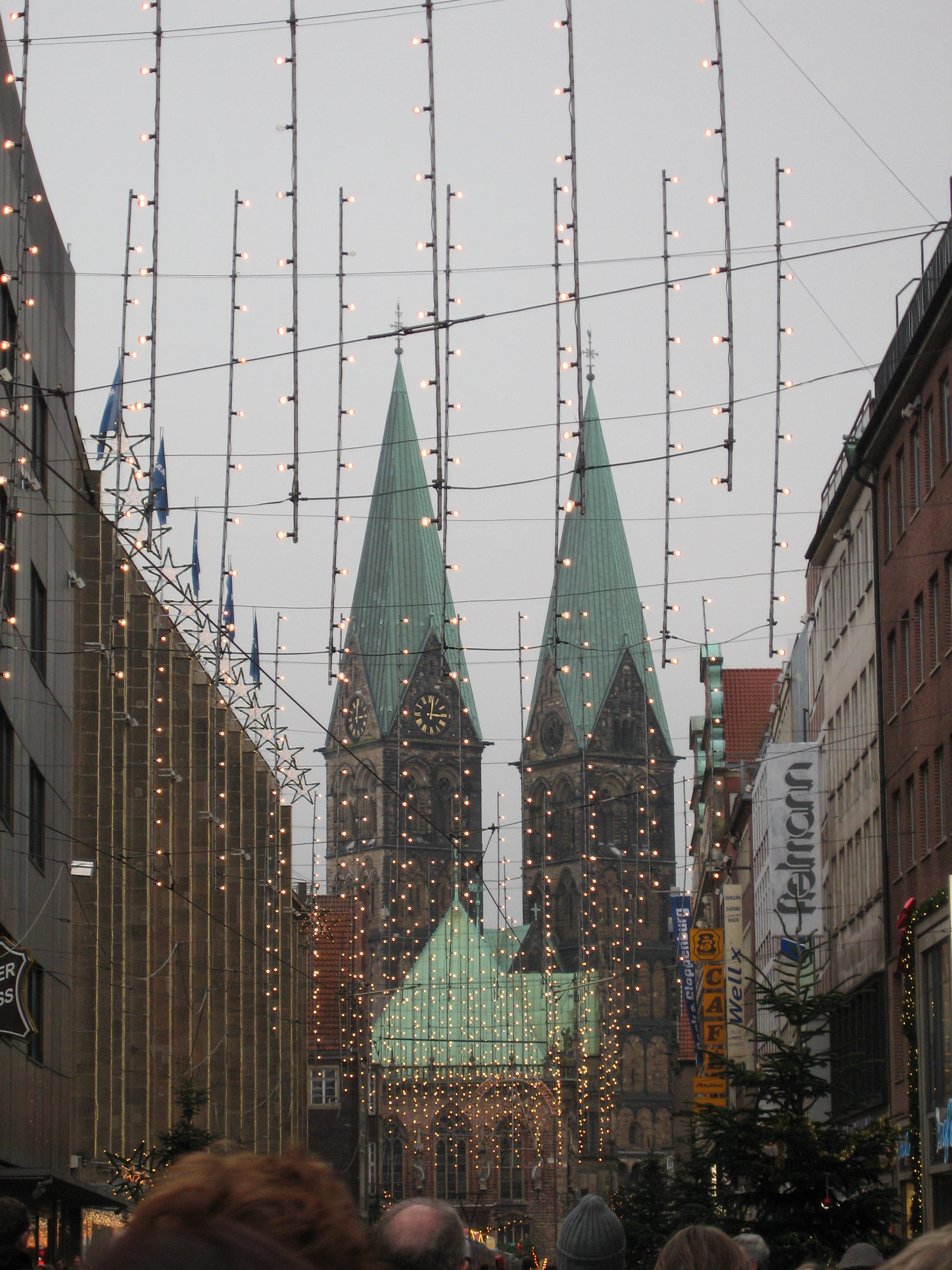 A view down the Obernstraße, our main shopping street, towards the St. Petri Dom (“Dom” means “cathedral” in Germany) with Christmas illuminations. The large brick building on the left is the Karstadt department store.